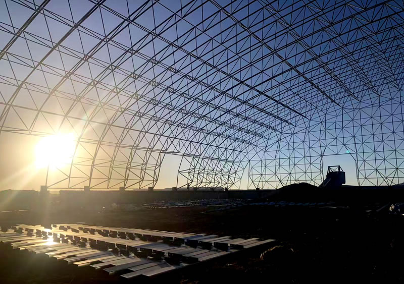 3、材料:正放四角錐螺栓球節(jié)點(diǎn)網(wǎng)架,按照甲方確認(rèn)的圖紙設(shè)計要求加工制作。網(wǎng)架主材材質(zhì)為Q355B鋼管,底漆二道70um,主檁條鍍鋅C型鋼C220*75*20*3.0,次檁條鍍鋅C型鋼C180*70*20*2.5,屋面板0.5mm厚彩鋼單板